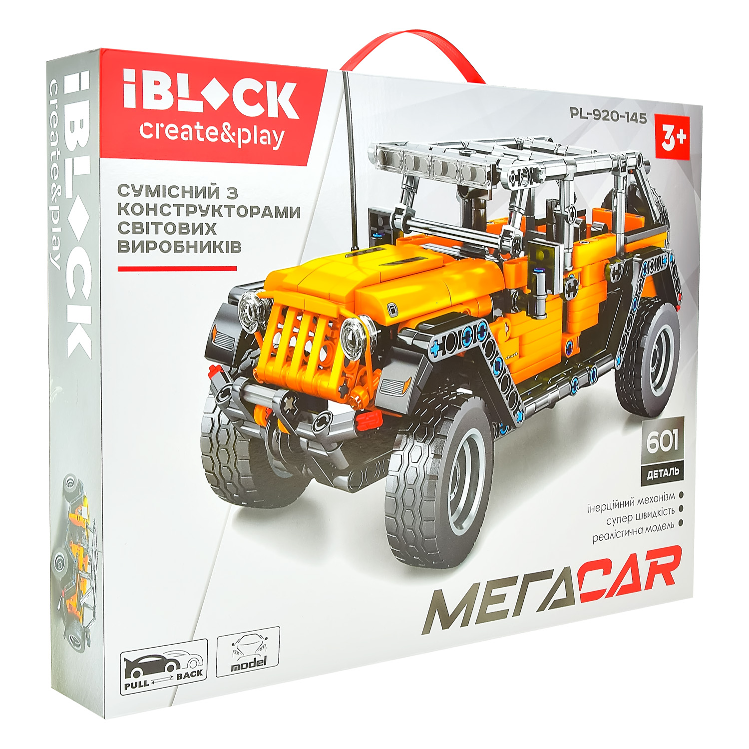 У наборі 601 деталь, з якої можна скласти реалістичну машинку помаранчевого кольору для змагань. Модель обладнана рухомими колесами з інерційним механізмом. Для початку руху поставте її на рівну горизонтальну поверхню, потягніть машинку до себе та відпустіть.