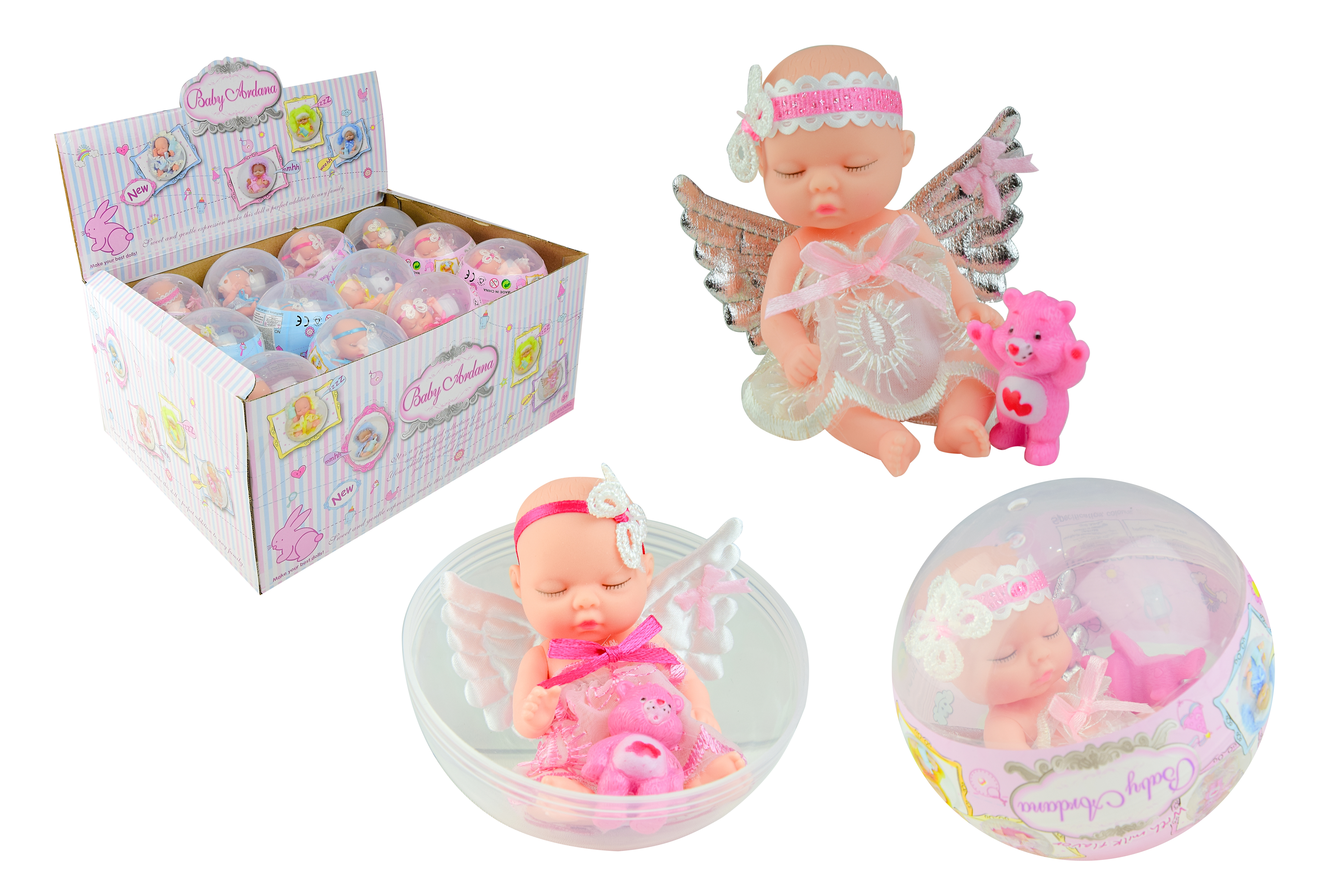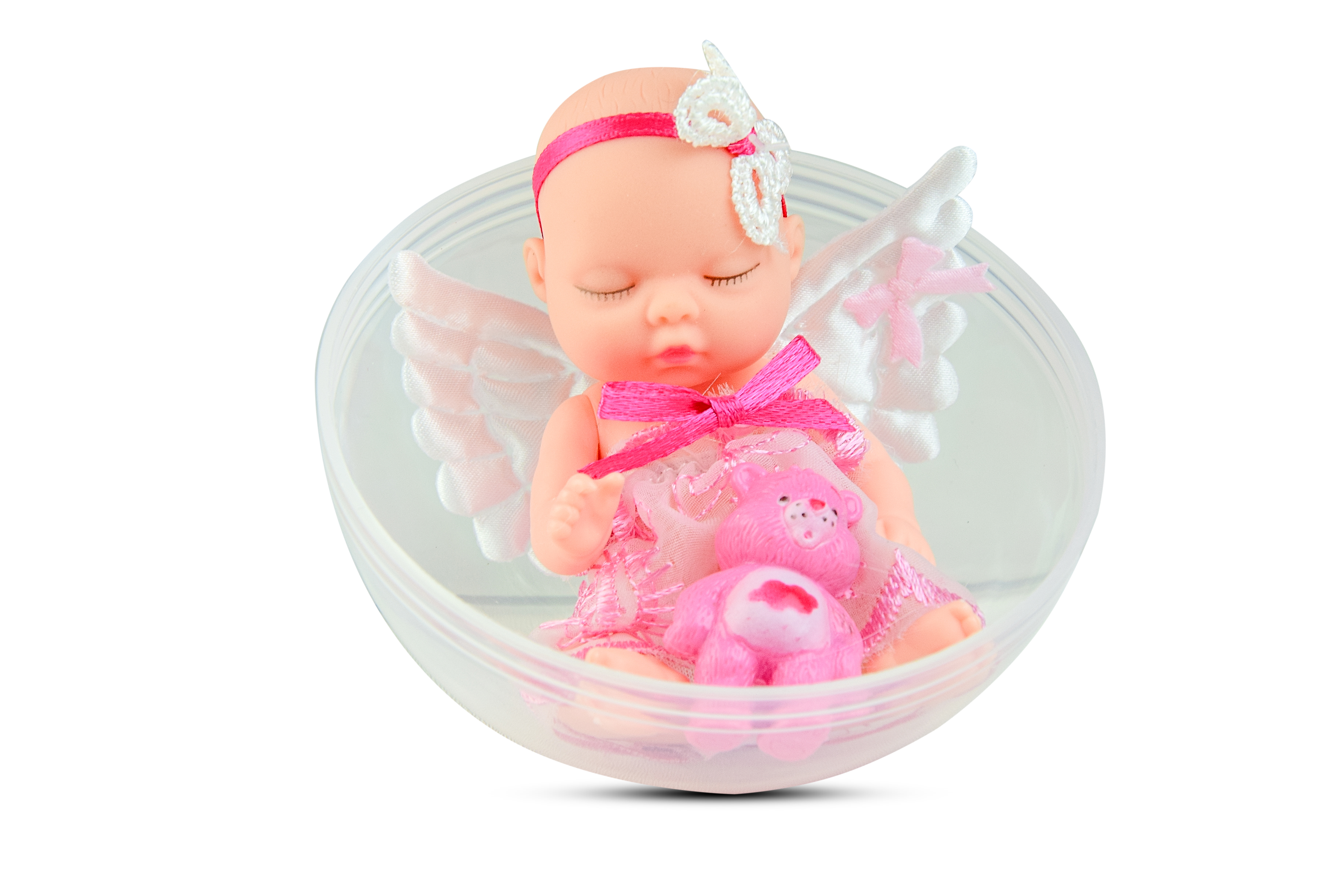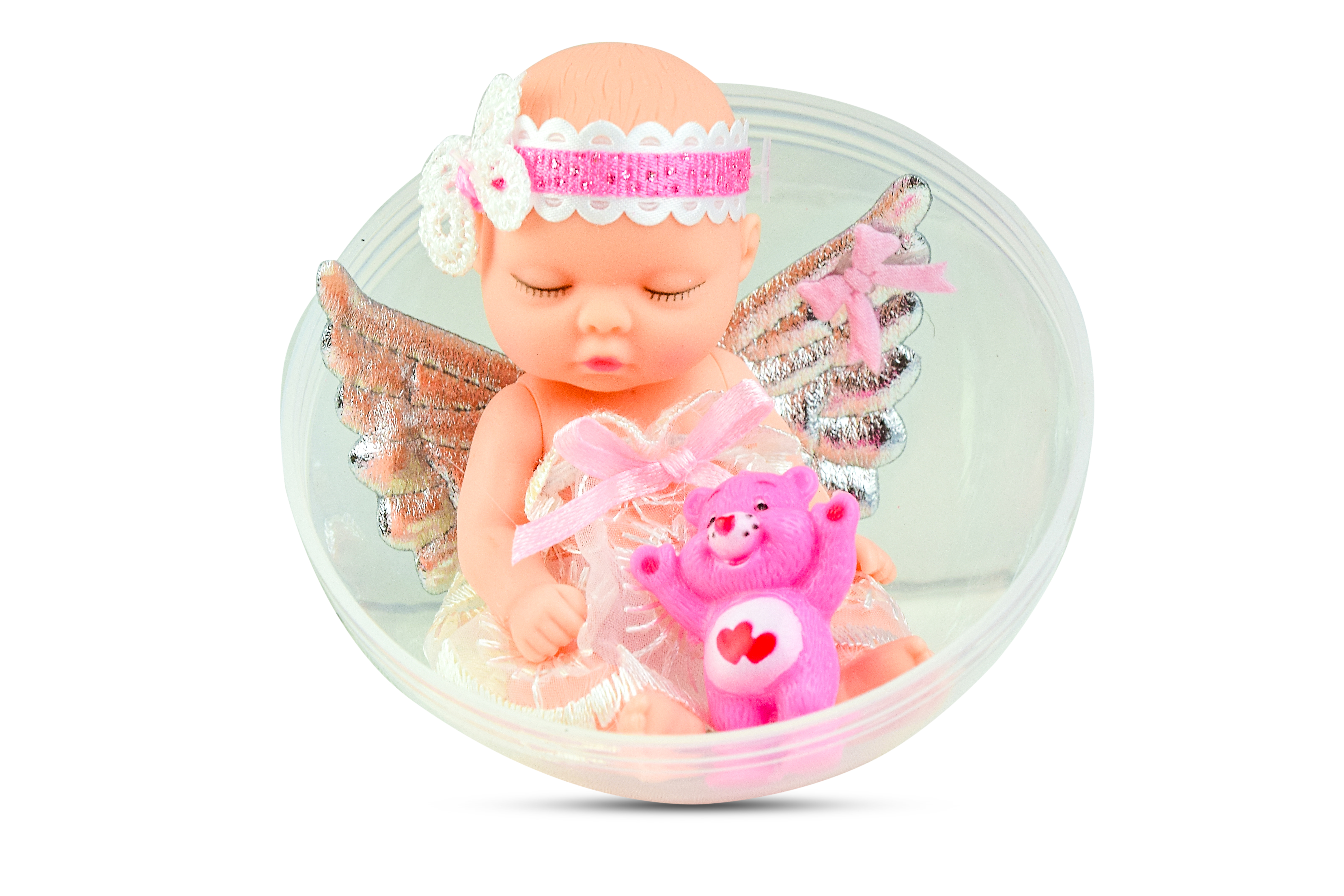 Кукла в пластиковом шарике. Спящий пупс-ангелочек с мишкой.
