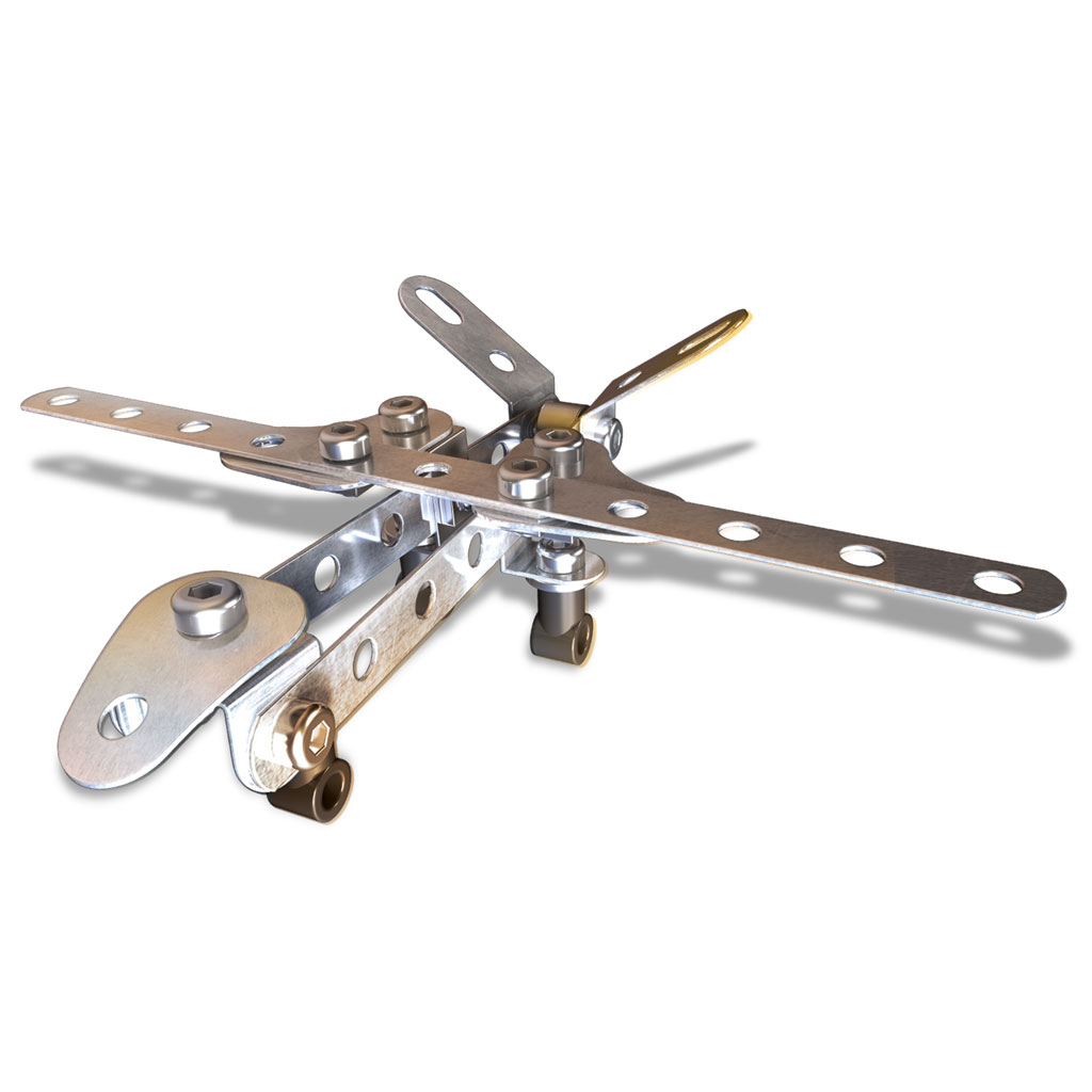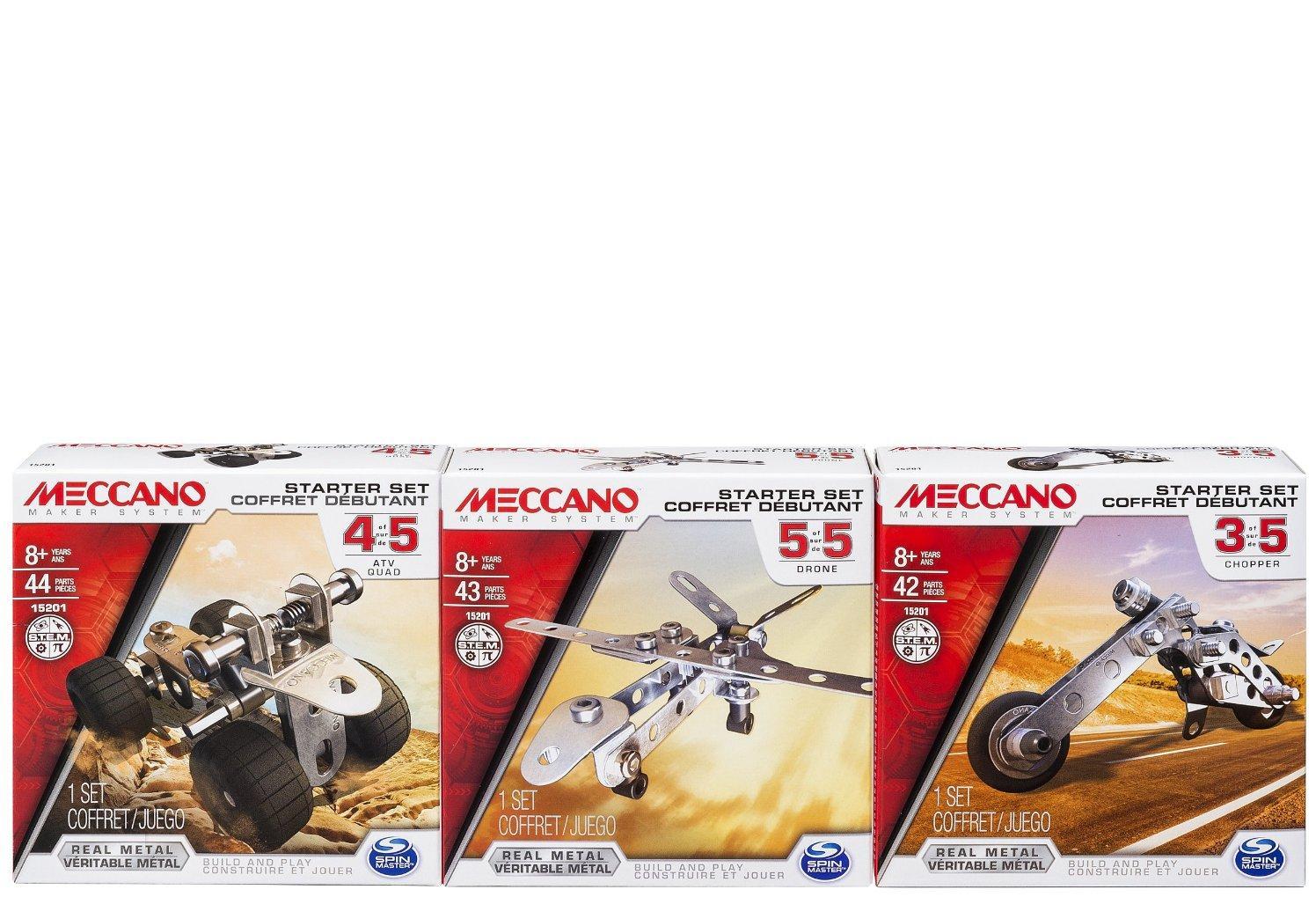 - Линейка включает в себя следующие наборы конструкторов Meccano: гоночный автомобиль, мотоцикл, мотоцикл-чоппер, квадроцикл, беспилотник.