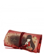 Аксессуар можно использовать для хранения косметики и украшений. Косметичка по форме напоминает сверток, внутри два отделения на молнии, завязывается бархатными лентами. Изделие изготовлено из эко-кожи с нанесением изображений девочки Gorjuss.