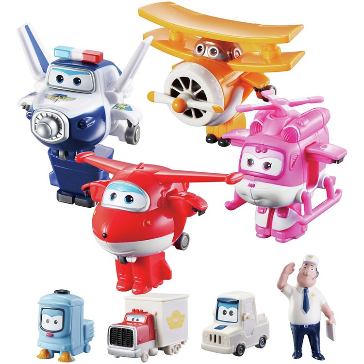 Герои мультсериала трансформируются и могут стать самолётом с вращающимися колёсиками или роботом с подвижными деталями. Так же в наборе присутствуют 4 фигурки других героев мульсериала.