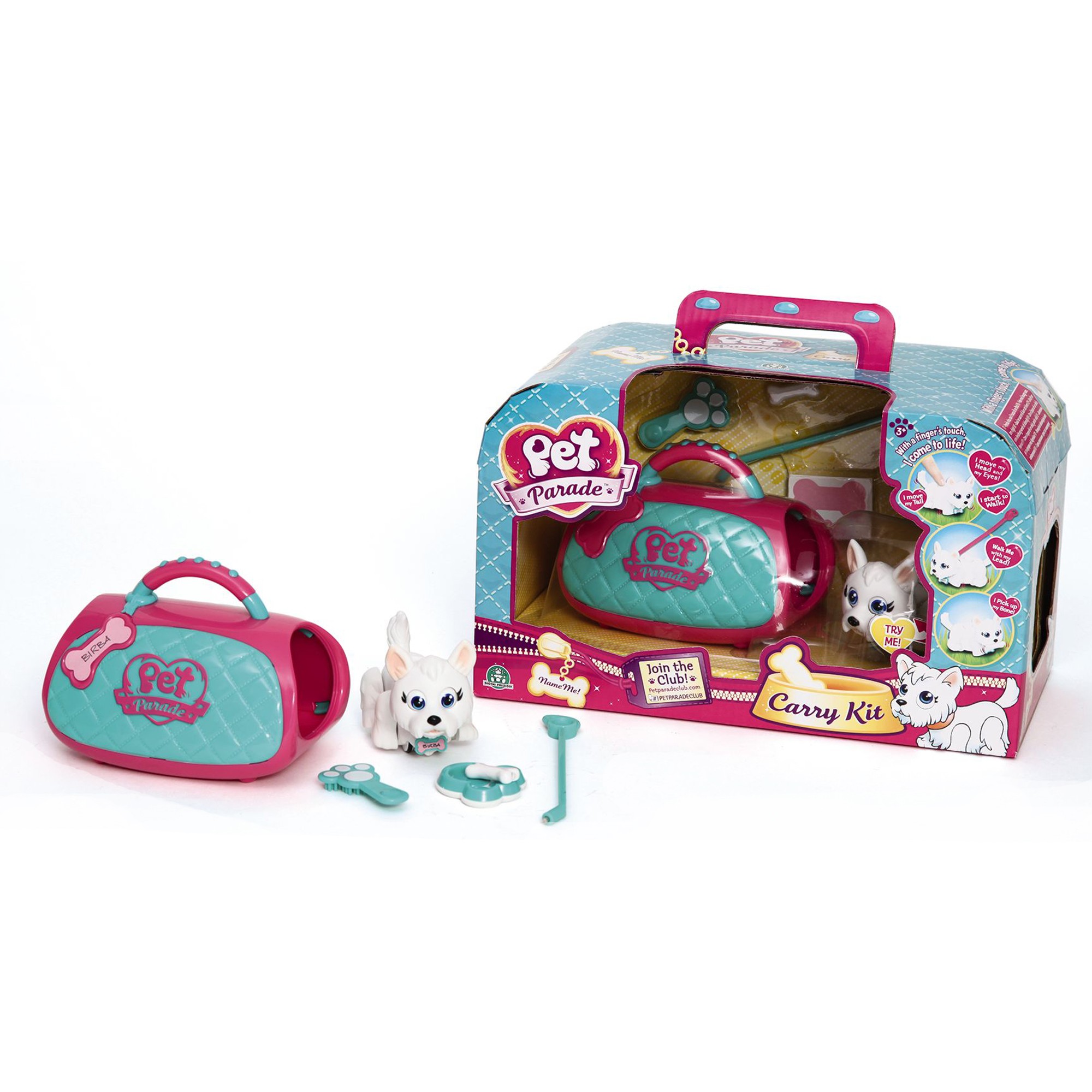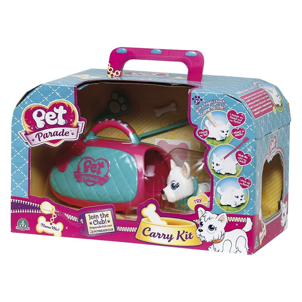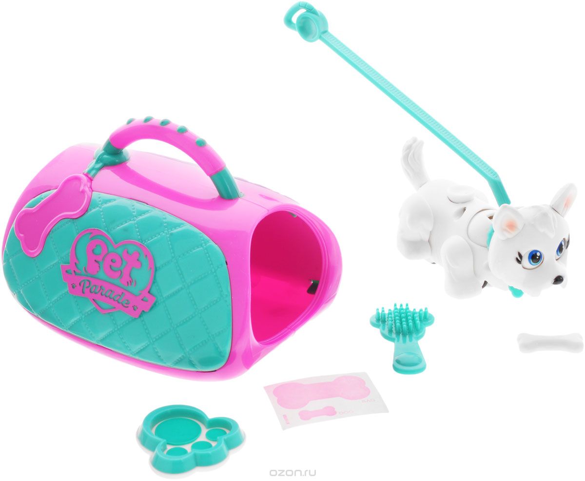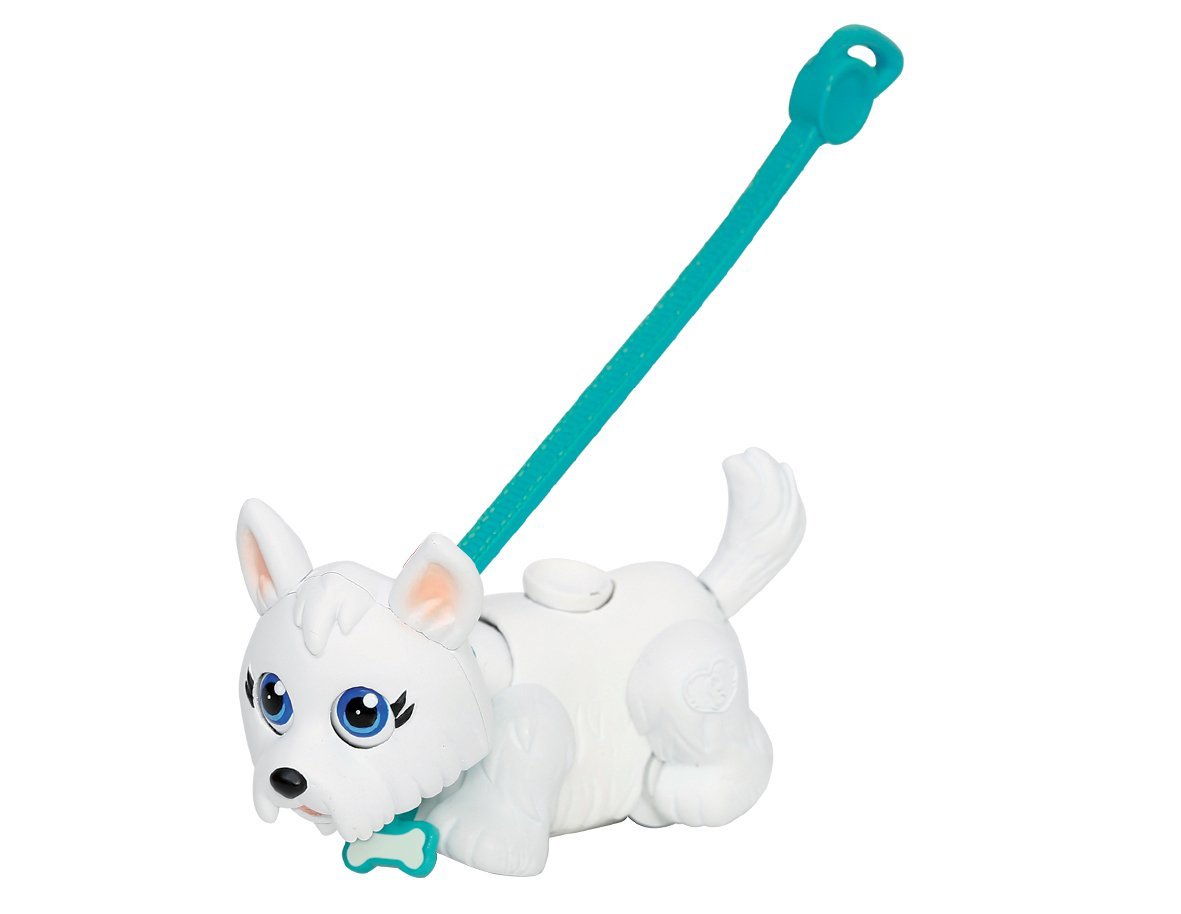 Игровой набор переноска со щенком породы Вест-Хайленд-Уайт терьер. Фигурка двигается с помощью магнитного «поводка» или при надавливании пальцем на кнопку на спине фигурки. Магнитный поводок прикрепляется к ошейнику на животном. При управлении с помощью кнопки на спине фигурка будет забавно двигать лапками, головой и глазами при ходьбе. Благодаря встроенным магнитам питомец может носить косточку либо играть с другим мини-животным из коллекции. На ошейнике фигурки есть бирка в виде косточки, на которой можно написать имя любимца. В набор также входит косточка, мисочка для еды и питья, щетка для ухода за шерской, поводок и лакомство в виде косточки.
