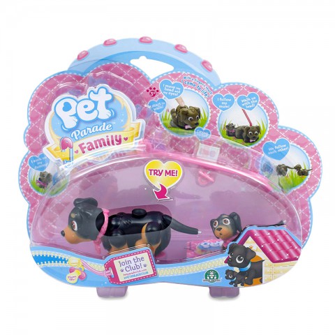 Игровой набор собаки и щенка породы ротвейлер, которые двигаются с помощью магнитного «поводка» или при надавливании пальцем на кнопку на спине фигурки. Магнитный поводок прикрепляется к ошейнику на животном. При управлении с помощью кнопки на спине фигурка будет забавно двигать лапками, головой и глазами при ходьбе. Благодаря встроенным магнитам питомец может носить косточку (сосочку) либо играть с другим мини-животным из коллекции. На ошейнике фигурки есть бирка, на которой можно написать имя любимца.