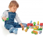 В набор входят 37 строительных блоков, 3 фигурки животных (собака, лошадь, корова), машинка, фермер.