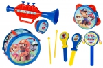 Барабан с палочками, труба, бубен, ручной барабан и 2 вида кастаньет.