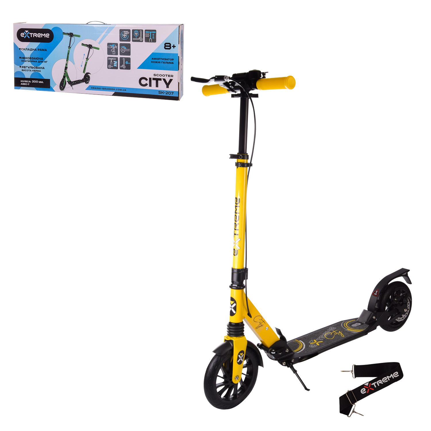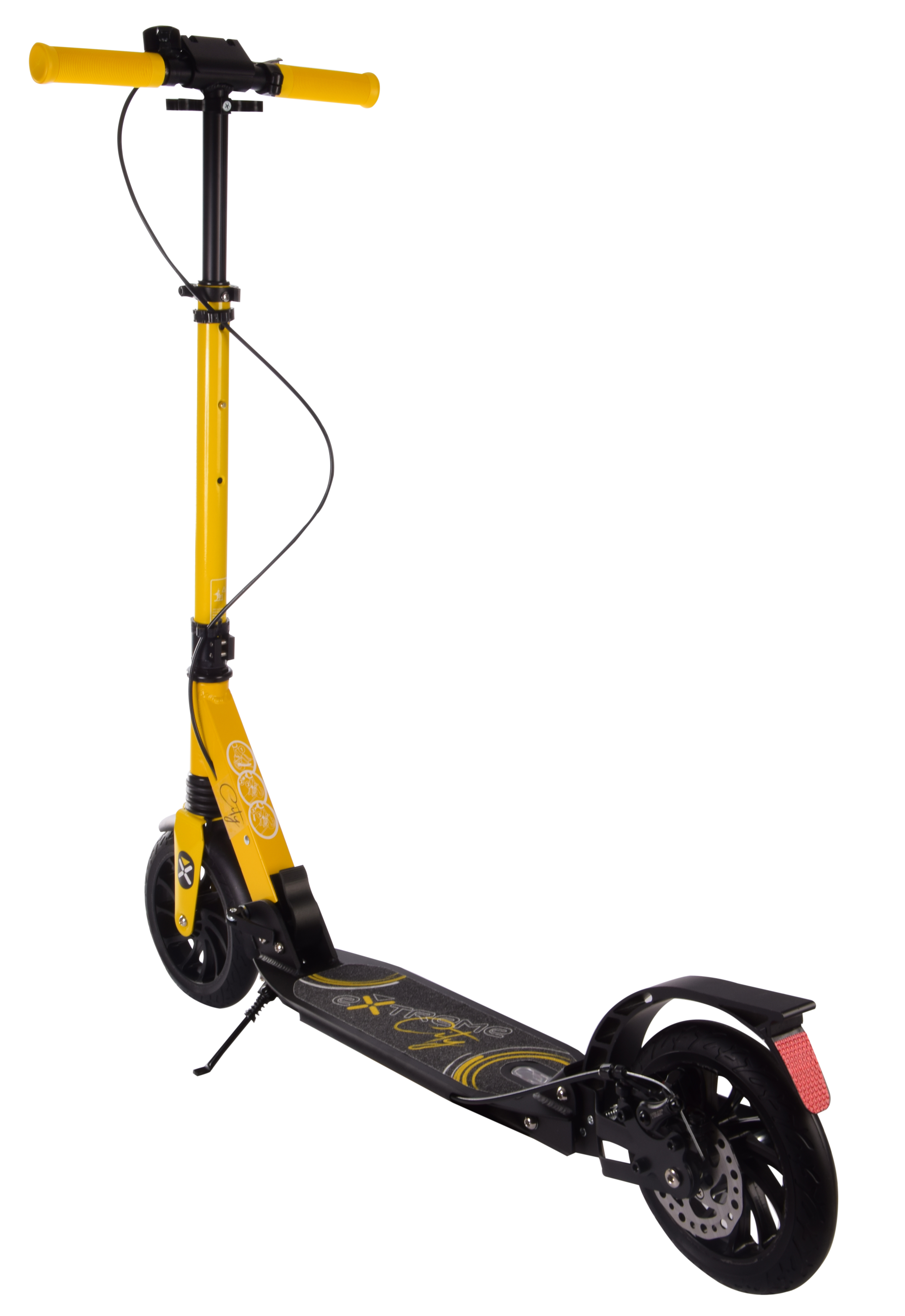 Максимально укомплектованный городской самокат от "Extreme Motion", максимально комфортная модель CITY. Колёса диаметром 200 мм на подшипниках Abec 7 позволяют преодолевать расстояния, требуя минимум ваших усилий. Передний и задний амортизаторы делают ваши поездки максимально комфортными. Ручной тормоз позволит с лёгкостью маневрировать вам на крутых поворотах. Самокат CITY выполнен из высокопрочного алюминия и имеет регулируемый по высоте руль в трёх положениях. Крылья спереди и сзади сохранят Вашу одежду в чистоте.