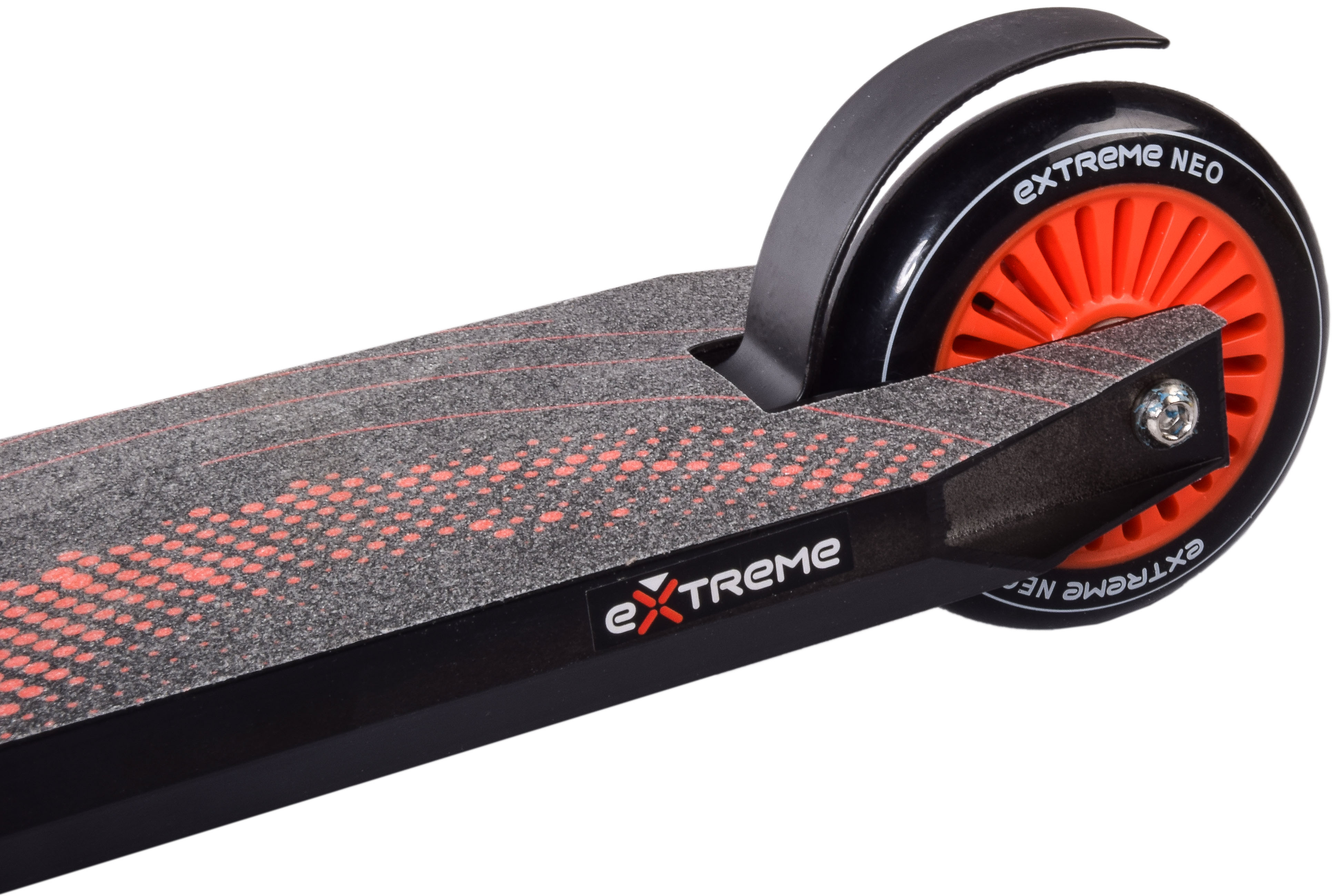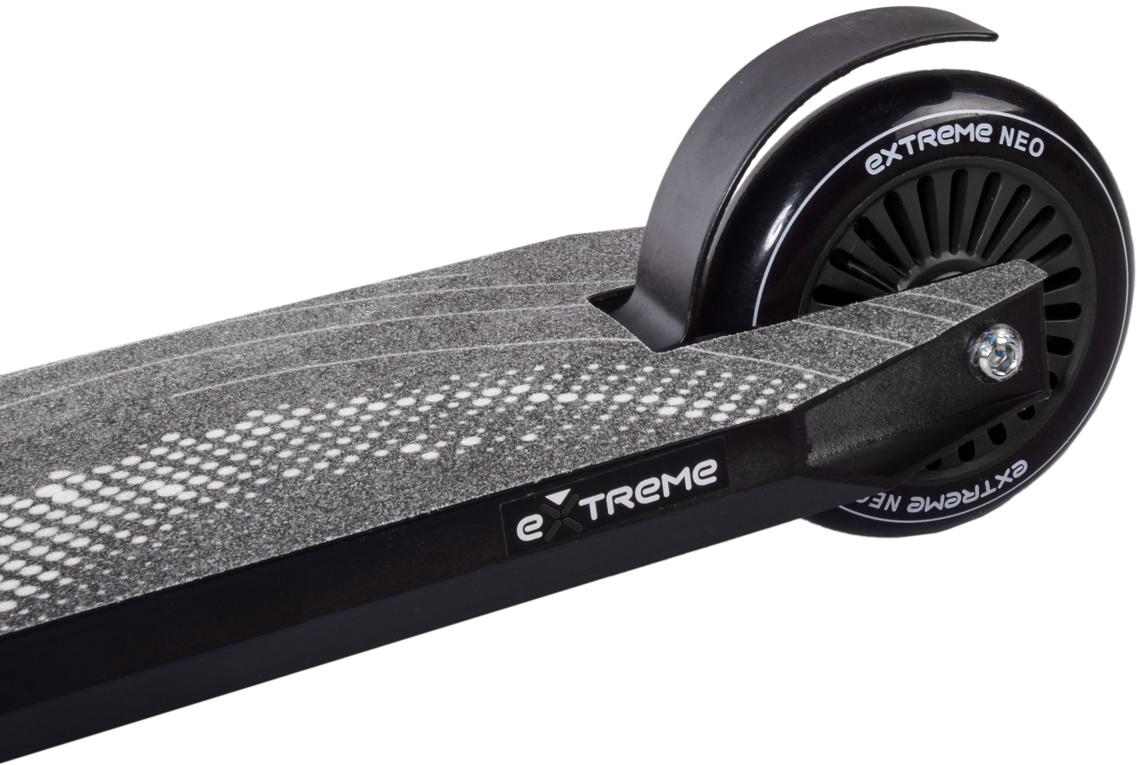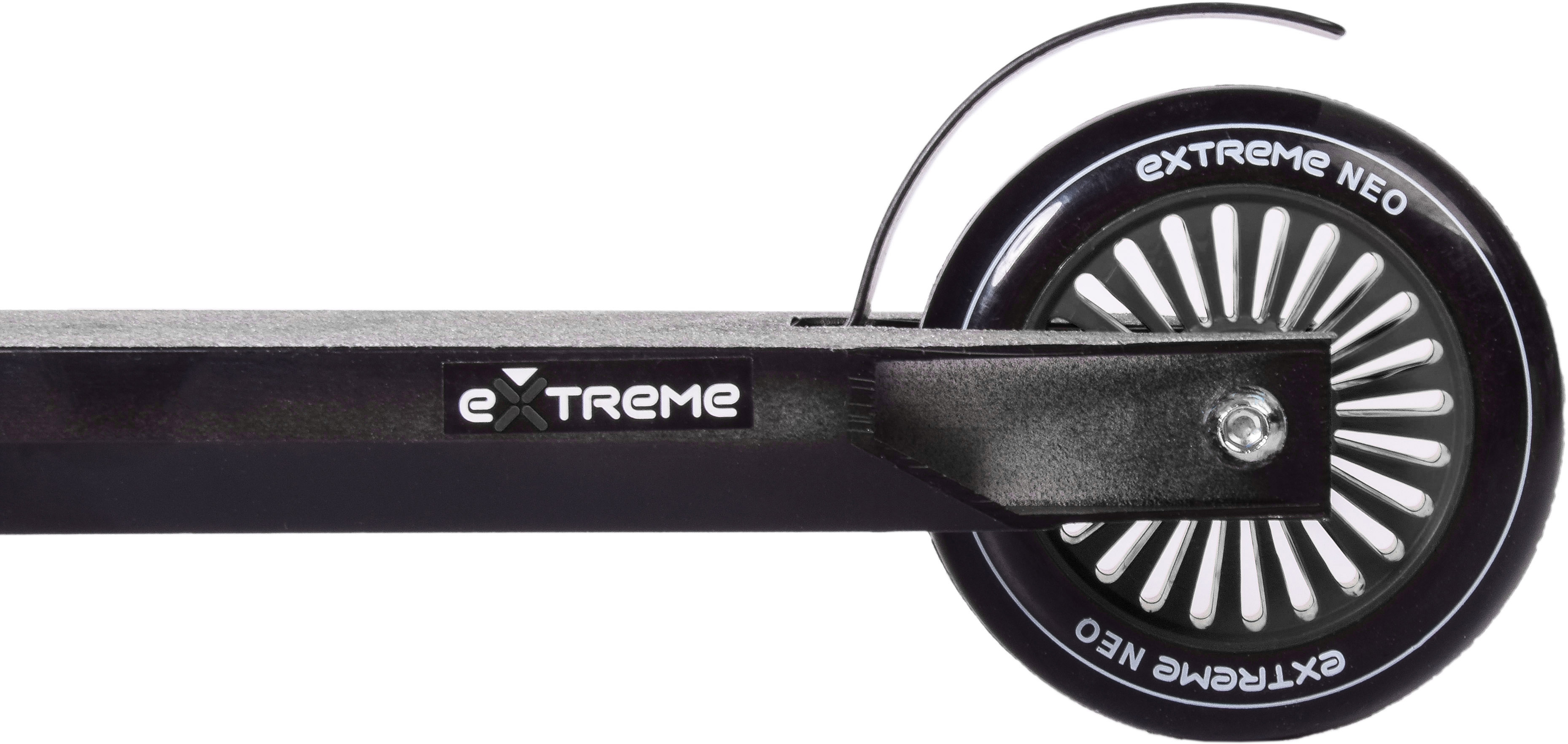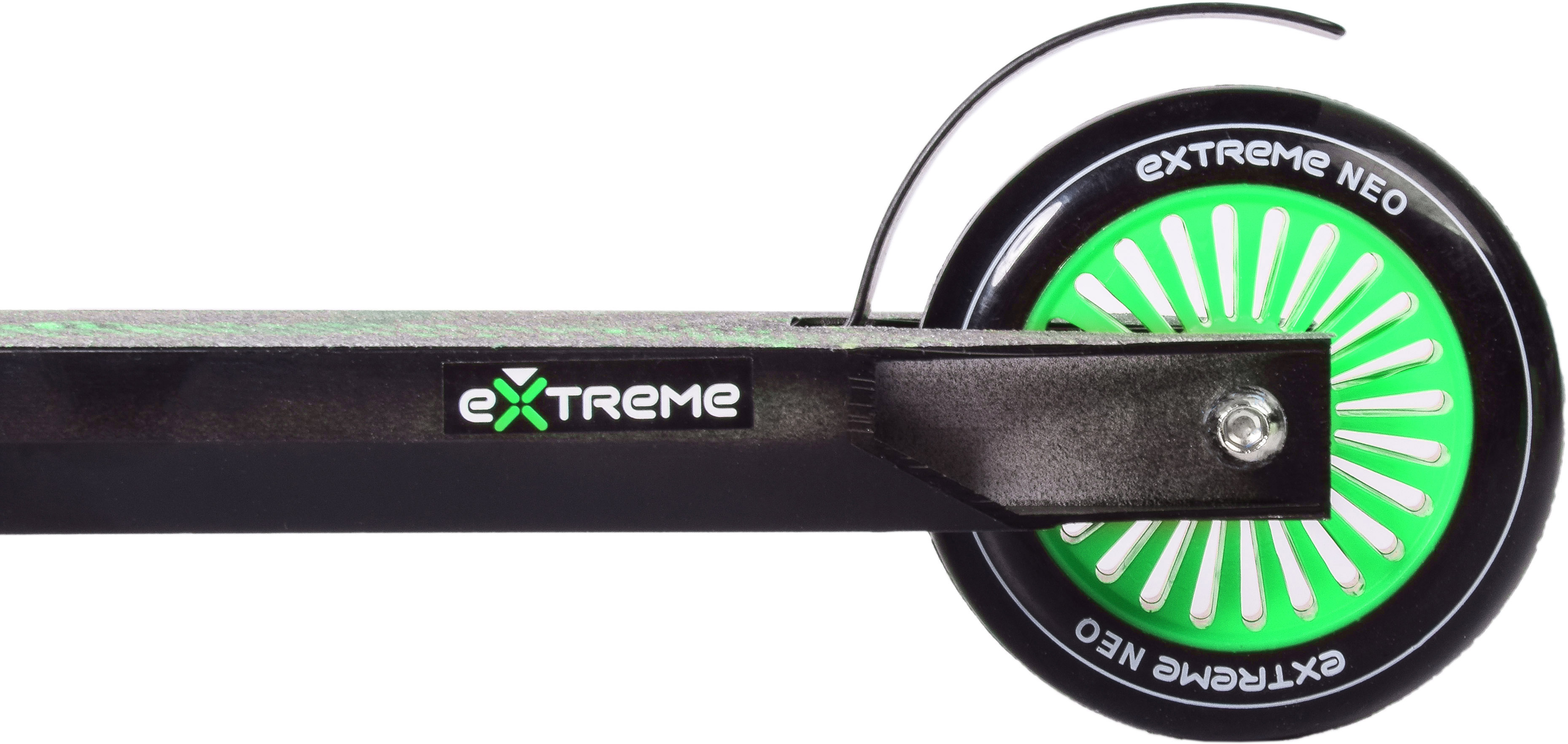 Колёса экстрим самоката диаметром 120 мм на цельных алюминиевых дисках с классом жёсткости PU 82A на лучших подшипниках ABEC-9 позволяют быстрее разгоняться и набирать более высокую скорость.